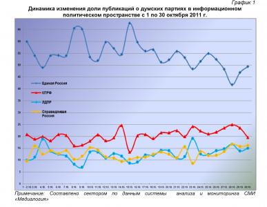 За период 24 – 30 октября 2011 г. в информационном пространстве было зафиксировано 2015 упоминаний партии «Единая Россия» или 49% от общего числа высказываний, озвученных в адрес парламентских партий. В 936 материалах (22,8%) фигурировала КПРФ, в 586 (14,3%) – ЛДПР, а в 571 (13,9%) – «Справедливая Россия».