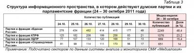 Обобщение результатов контент-анализа публикаций СМИ, приведённых в таблицах 1 и 2, позволил определить структуру информационного пространства, в котором действуют как думские партии, так и их парламентские фракции (таблица 3, график 3).