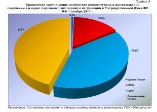 1 ноября 2011 г. в информационном пространстве отмечалось 608 упоминаний партии «Единая Россия» или 58% от общего числа высказываний, озвученных в адрес парламентских партий. В 204 материалах (19,4%) фигурировала КПРФ, в 119 (11,3%) – «Справедливая Россия», а в 118 (11,3%) – ЛДПР.