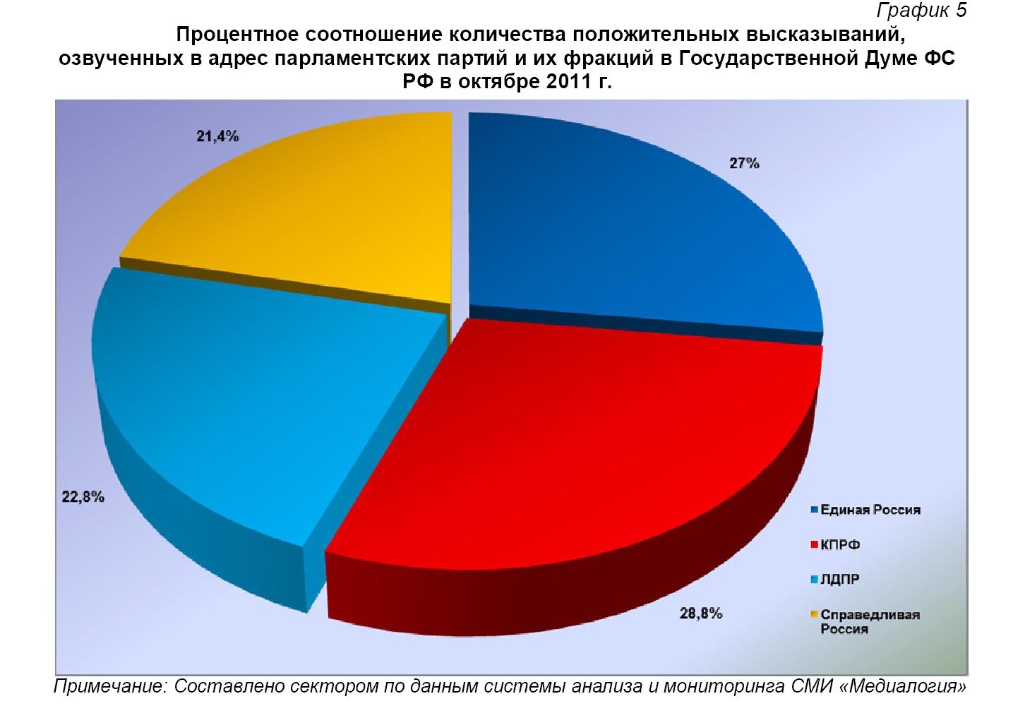 Итоговое процентное соотношение количества положительных высказываний, озвученных в адрес парламентских партий и их фракций в Государственной Думе в октябре 2011 г., составило: 28,8% от суммарного партийного ИИБ – у КПРФ, 27% - у «Единой Россией», 22,8% - у ЛДПР и 21,4% - у «Справедливой России» (график 5).