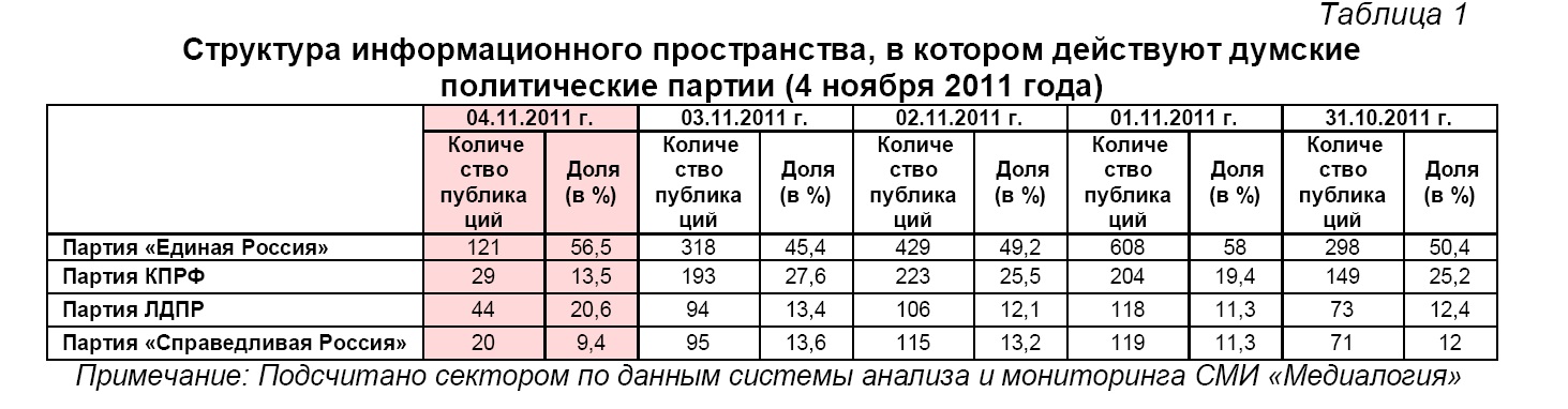 Контент-анализ публикаций СМИ с помощью системы «Медиалогия» позволил выявить следующую структуру информационного пространства, в котором действуют думские политические партии (таблица 1).