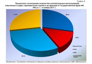 Процентное соотношение количества положительных высказываний, озвученных в адрес парламентских партий и их фракций в Государственной Думе ФС РФ за 1 – 4 ноября 2011 г.