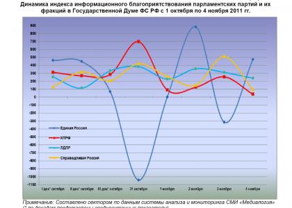 Динамика индекса информационного благоприятствования парламентских партий и их фракций в Государственной Думе ФС РФ с 1 октября по 4 ноября 2011 гг.