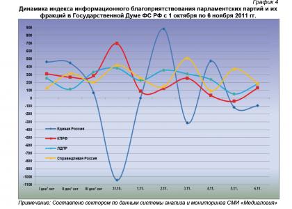 5 ноября лидирующую позицию в рейтинге информационного благоприятствования заняла «Справедливая Россия», чей индекс информационного благоприятствования (ИИБ) вырос с 96,8 (4 ноября) до 375,9, но спустя день упал – до 191,7 (график 4).