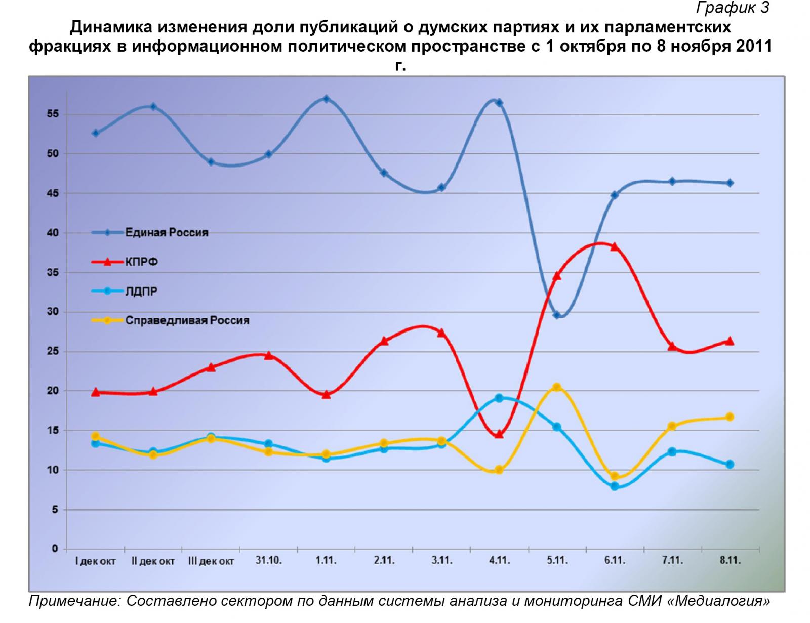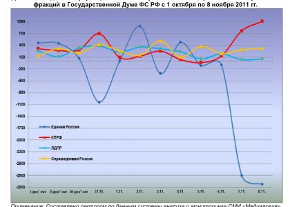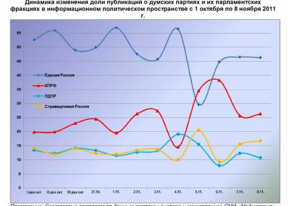 Динамический ряд, отражающий порядок наполнения медиа-потока публикациями о деятельности парламентских партий за период с 1 октября по 8 ноября 2011 г. (график 1), позволяет заключить, что 7 – 8 ноября информационные показатели рассматриваемых политических сил были близки к средним за анализируемый временной отрезок значениям (с небольшим завышением – у КПРФ и «Справедливой России» и занижением – у «Единой России»).