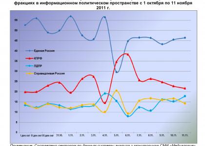 11 ноября 2011 г. в информационном пространстве отмечалось 320 упоминаний партии «Единая Россия» или 47,4% от общего числа высказываний, озвученных в адрес парламентских партий. В 140 материалах (20,7%) фигурировала КПРФ, в 119 (17,7%) – ЛДПР, а в 96 (14,2%) – «Справедливая Россия».