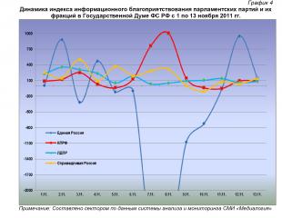 12 – 13 ноября лидирующую позицию в рейтинге информационного благоприятствования занимала «Единая Россия», чей индекс информационного благоприятствования (ИИБ) 12 ноября взлетел до 952,6, но на следующий день упал до 157,3 (при -60,7 – 11 ноября) (график 4).