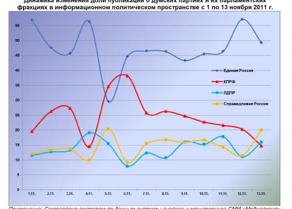 Анализ динамики доли публикаций о фракциях парламентских партий за 1 по 13 ноября 2011 года (график 2) позволяет заключить, что на 12 ноября пришёлся максимальный процент упоминания в СМИ думских единороссов, минимальный – эсеров при стремящемся к среднему – коммунистов и либерал-демократов. 13 ноября фиксировался близкий к максимальному процентный показатель ЛДПР, а к минимальному – КПРФ и «СР» при среднем за последний осенний месяц – «ЕР».