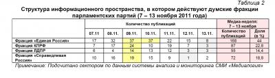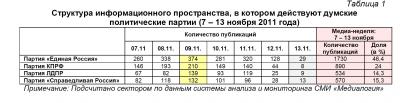 Контент-анализ публикаций СМИ с помощью системы «Медиалогия» позволил выявить следующую структуру информационного пространства, в котором действуют думские политические партии (таблица 1, график 1).