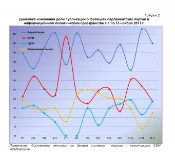 За период 7 – 13 ноября 2011 г. в информационном пространстве было зафиксировано 1730 упоминаний партии «Единая Россия» или 46,4% от общего числа высказываний, озвученных в адрес парламентских партий. В 890 материалах (24%) фигурировала КПРФ, в 570 (15,3%) – «Справедливая Россия», а в 534 (14,3%) – ЛДПР.