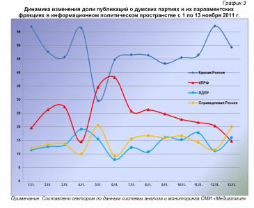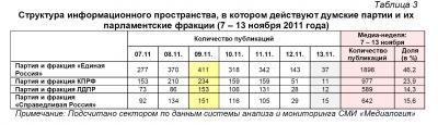 Обобщение результатов контент-анализа публикаций СМИ, приведённых в таблицах 1 и 2, позволил определить структуру информационного пространства, в котором действуют как думские партии, так и их парламентские фракции (таблица 3, график 3).