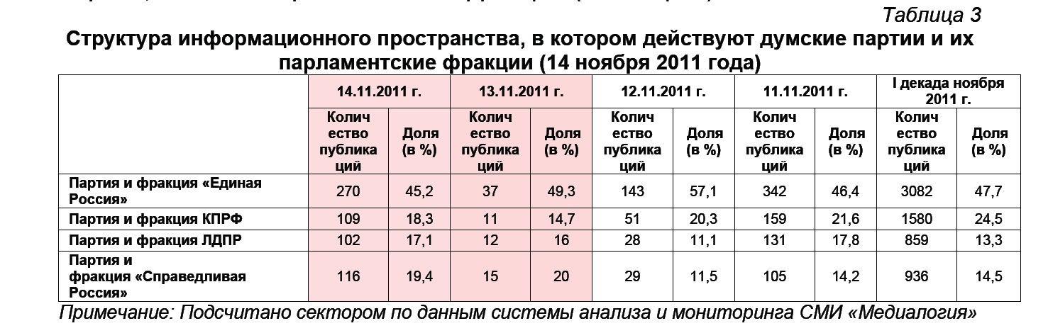Контент-анализ публикаций СМИ с помощью системы «Медиалогия» позволил выявить следующую структуру информационного пространства, в котором действуют думские политические партии (таблица 1).