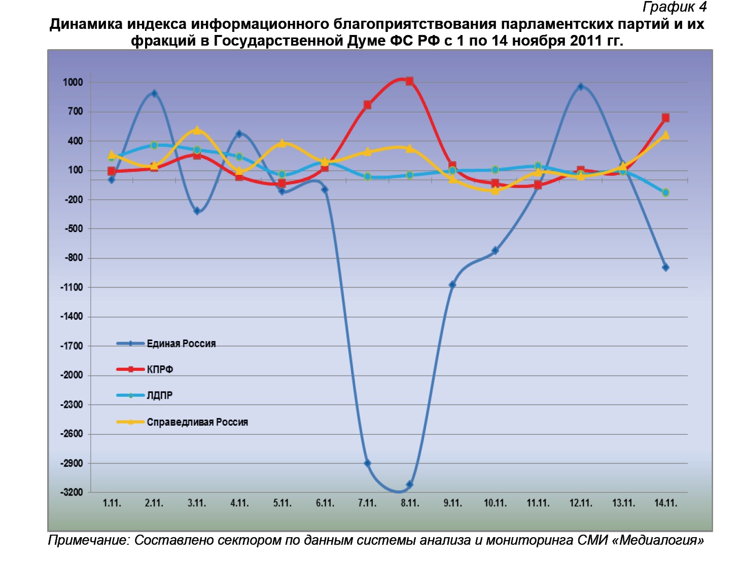 Анализ динамики доли публикаций о фракциях парламентских партий за 1 – 14 ноября 2011 года (график 2) позволяет заключить, что 14 ноября процент упоминаний в средствах массовой информации депутатов-единороссов достиг максимального за рассматриваемый период значения, коммунистов — минимального, эсеров — близкого к максимуму при среднем либерал-демократов.