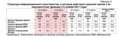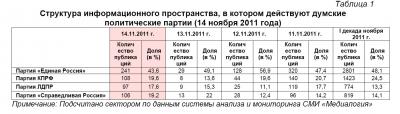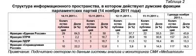 Контент-анализ публикаций СМИ с помощью системы «Медиалогия» позволил выявить следующую структуру информационного пространства, в котором действуют думские политические партии (таблица 1).