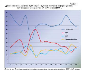 Динамика изменения доли публикаций о думских партиях и их парламентских фракциях в информационном политическом пространстве с 1 по 14 ноября 2011 г.