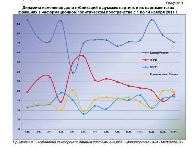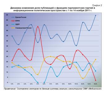 Анализ динамики доли публикаций о фракциях парламентских партий за 1 – 14 ноября 2011 года (график 2) позволяет заключить, что 14 ноября процент упоминаний в средствах массовой информации депутатов-единороссов достиг максимального за рассматриваемый период значения, коммунистов — минимального, эсеров — близкого к максимуму при среднем либерал-демократов.