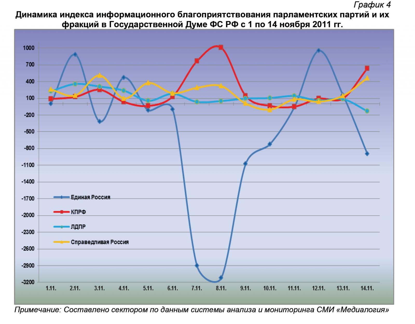 Анализ динамики доли публикаций о фракциях парламентских партий за 1 – 14 ноября 2011 года (график 2) позволяет заключить, что 14 ноября процент упоминаний в средствах массовой информации депутатов-единороссов достиг максимального за рассматриваемый период значения, коммунистов — минимального, эсеров — близкого к максимуму при среднем либерал-демократов.