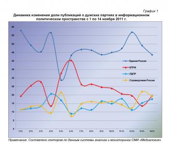 Динамический ряд, отражающий порядок наполнения медиа-потока публикациями о деятельности парламентских партий за период с 1 по 14 ноября 2011 г. (график 1), позволяет заключить, что 14 ноября показатель единороссов и коммунистов был близок к минимальному, эсеров – к максимальному, а либерал-демократов — среднему за анализируемый период значению.