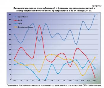 Анализ динамики доли публикаций о фракциях парламентских партий за 1 – 14 ноября 2011 года (график 2) позволяет заключить, что 14 ноября процент упоминаний в средствах массовой информации депутатов-единороссов достиг максимального за рассматриваемый период значения, коммунистов — минимального, эсеров — близкого к максимуму при среднем либерал-демократов.