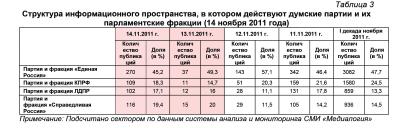 Обобщение результатов контент-анализа публикаций СМИ, приведённых в таблицах 1 и 2, позволил определить структуру информационного пространства, в котором действуют как думские партии, так и их парламентские фракции (таблица 3).