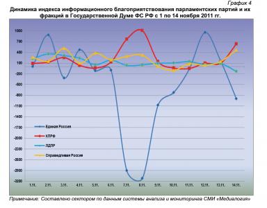 14 ноября 2011 г. в информационном пространстве отмечалось 241 упоминание партии «Единая Россия» или 43,6% от общего числа высказываний, озвученных в адрес парламентских партий. В 108 материалах (19,6%) фигурировала КПРФ, в 106 (19,2%) – «Справедливая Россия», а в 97 (17,6%) – ЛДПР.