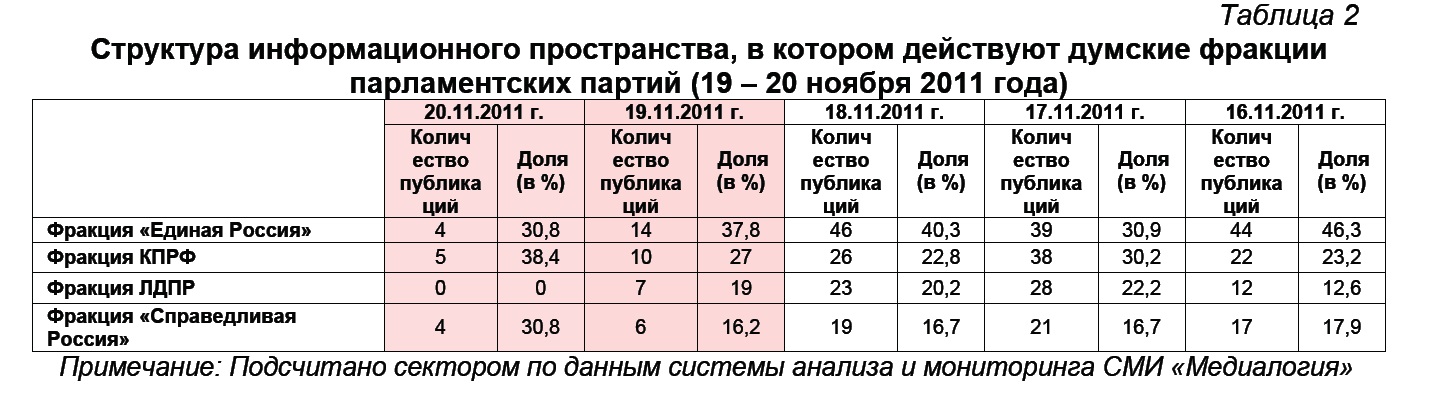 Контент-анализ публикаций СМИ позволил выявить также структуру информационного пространства, в котором действуют думские фракции парламентских партий (таблица 2).