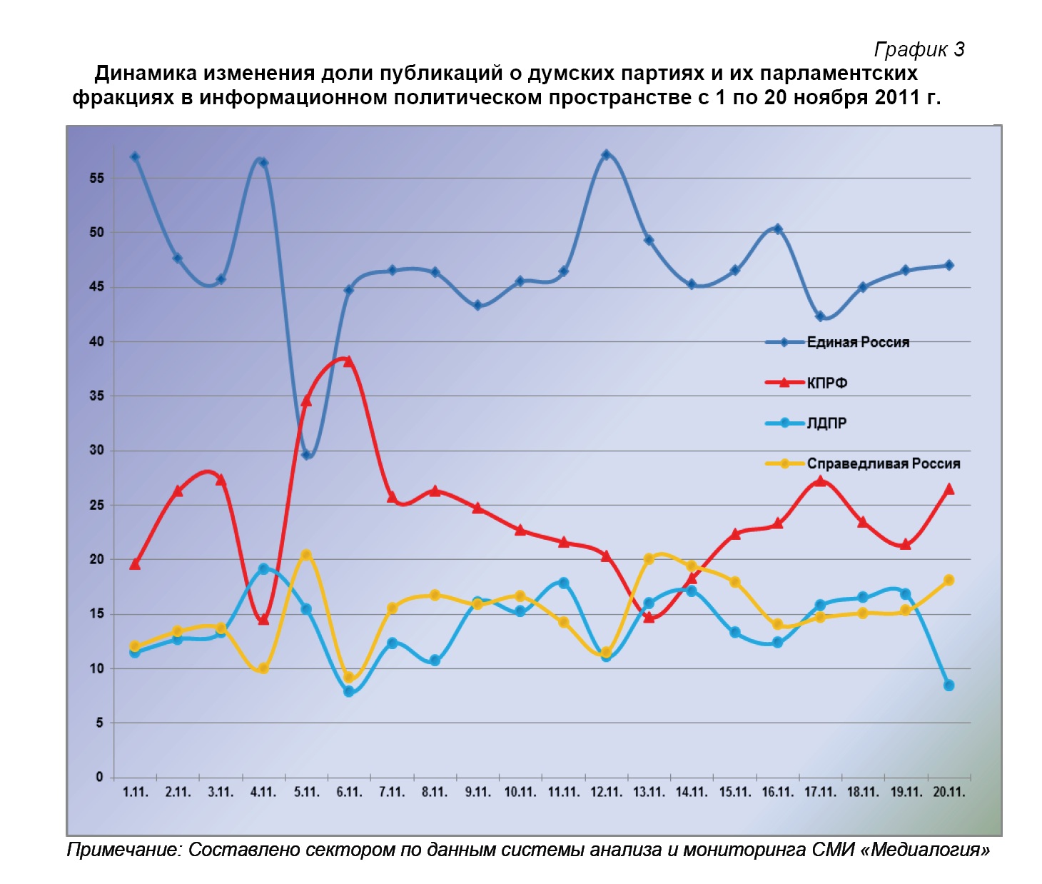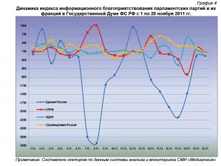 Анализ динамики доли публикаций о фракциях парламентских партий за 1 по 20 ноября 2011 года (график 2) позволяет заключить, что на 19 ноября пришёлся стремящийся к максимальному процент упоминания в СМИ думских либерал-демократов, к минимальному – единороссов и эсеров, а к среднему – коммунистов. 20 ноября фиксировался максимальный процентный показатель «СР», близкий к максимуму – КПРФ, а минимальный – «ЕР» и ЛДПР.