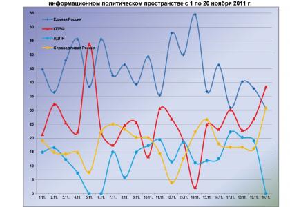 Динамический ряд, отражающий порядок наполнения медиа-потока публикациями о деятельности парламентских партий за период с 1 по 20 ноября 2011 г. (график 1), позволяет заключить, что 19 ноября показатели рассматриваемых политических сил были близки к среднемесячному уровню (с небольшим превышением – у либерал-демократов и единороссов и занижением – у коммунистов). 20 ноября степень присутствия в информационном пространстве ЛДПР достигла ноябрьского минимума, «ЕР» – стремилась к максимуму, а КПРФ и «СР» - к средним значениям.
