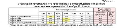 Контент-анализ публикаций СМИ с помощью системы «Медиалогия» позволил выявить следующую структуру информационного пространства, в котором действуют думские политические партии (таблица 1, график 1).