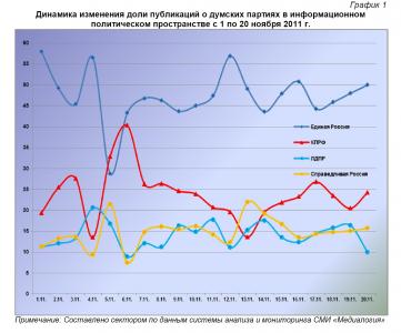 При этом наибольшее число публикаций, в которых были упомянуты депутаты-эсеры (29 сюжетов), фиксировалось 15 ноября, для коммунистов (38) и либерал-демократы (28) – 17 ноября. Пик информационной активности единороссов (46) пришёлся на 18 ноября.