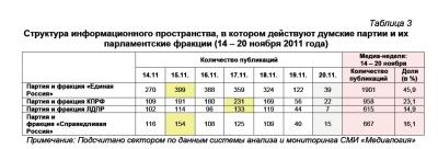 Обобщение результатов контент-анализа публикаций СМИ, приведённых в таблицах 1 и 2, позволил определить структуру информационного пространства, в котором действуют как думские партии, так и их парламентские фракции (таблица 3, график 3).