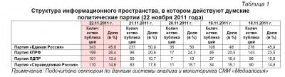 Контент-анализ публикаций СМИ с помощью системы «Медиалогия» позволил выявить следующую структуру информационного пространства, в котором действуют думские политические партии (таблица 1).