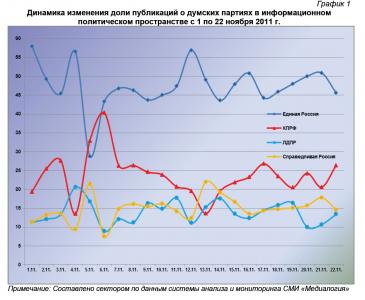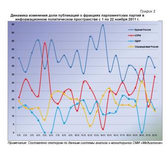 Динамический ряд, отражающий порядок наполнения медиа-потока публикациями о деятельности парламентских партий за период с 1 по 22 ноября 2011 г. (график 1), позволяет заключить, что 22 ноября показатель коммунистов был близок к максимальному, единороссов и либерал-демократов – к минимальному, а эсеров – к среднему за анализируемый период значению.