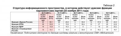 Контент-анализ публикаций СМИ позволил выявить также структуру информационного пространства, в котором действуют думские фракции парламентских партий (таблица 2).