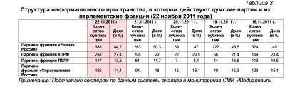 Обобщение результатов контент-анализа публикаций СМИ, приведённых в таблицах 1 и 2, позволил определить структуру информационного пространства, в котором действуют как думские партии, так и их парламентские фракции (таблица 3).