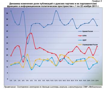 22 ноября 2011 г. в информационном пространстве отмечалось 343 упоминания партии «Единая Россия» или 45,6% от общего числа высказываний, озвученных в адрес парламентских партий. В 199 материалах (26,4%) фигурировала КПРФ, в 110 (14,6%) – «Справедливая Россия», а в 101 (13,4%) – ЛДПР.