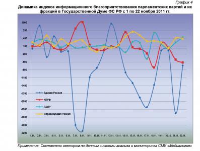 Совокупные информационные индексы парламентских партий и их фракций в Государственной Думе, в целом, отражают обозначенные выше закономерности распределения медиа-пространства 22 ноября: существенное укрепление по сравнению с предыдущим днём позиций КПРФ и ЛДПР и ослабление положения «Единой России» и «Справедливой России» (график 3). Суммарное число публикаций, в которых была упомянута «Единая Россия», составило 388 (44,7% всего новостного потока), КПРФ – 238 (27,4%), «Справедливая Россия» – 125 (14,4%), а ЛДПР – 117 (13,5%).