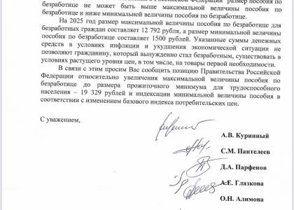 «Просим Правительство Российской Федерации рассмотреть возможность увеличения максимальной величины пособия по безработице до уровня прожиточного минимума для трудоспособного населения — 19 329 рублей, а также индексации минимальной величины в соответствии с изменением индекса потребительских цен», — говорится в обращении.