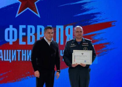 По поручению Заместителя Председателя Совета Федерации, Героя России Юрия Воробьёва, Айрат Гибатдинов вручил Благодарность Председателя Совета Федерации Валентины Ивановны Матвиенко директору кадетской школы Алексею Баранову.