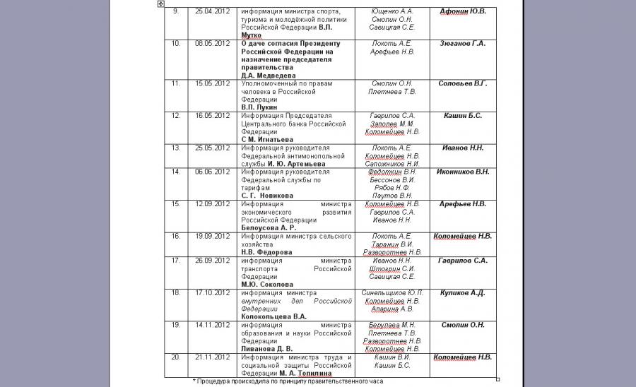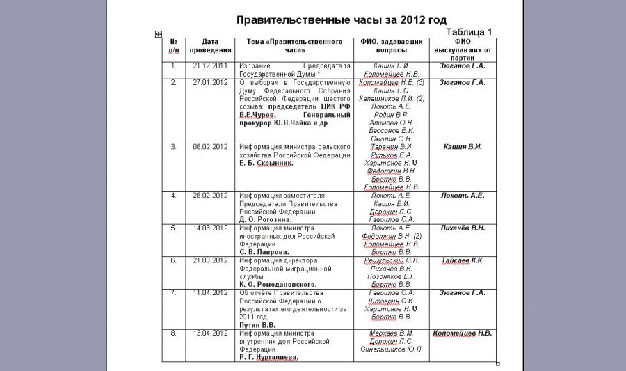 В 2012 году в Государственной Думе Федерального Собрания Российской Федерации прошло двадцать Правительственных часов в открытом режиме. Депутаты имели возможность напрямую задавать вопросы министрам в интересах своих избирателей и с парламентской трибуны высказывать позицию своих партий по тем или иным вопросам деятельности правительства
