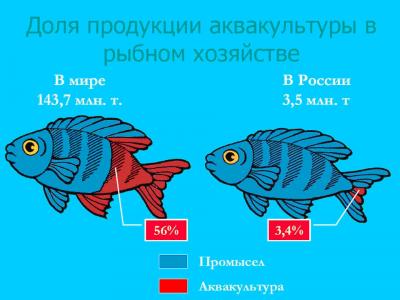 Примером в этом отношении являются такие страны, как Норвегия, Чили, Китай, Индия, Бангладеш. В этих странах аквакультура стала самым динамично развивающимся сектором экономики, обеспечивающим более трети потребления рыбы и морепродуктов. Если взять Китай, Вьетнам и другие страны, которые на этом направлении успешно работают по аквакультуре, то мы увидим, что речь идёт о 30-40 миллионах тонн рыбы, которые сегодня получает Китай за счет аквакультуры. Вьетнам в течение последних 15 лет получает более 3 миллиона тонн рыбы по аквакультуре. В Советское время мы работали на этом направлении на уровне современного Китая 20 лет назад. А сегодня скатились до 150 тысячах тонн. И это при том огромном потенциале, которым обладает наша страна с ее огромными морями и внутренними водоемами, начиная от Южных Курил, Сахалина, Приморья - до прудового, озёрного хозяйства. В мире 56% в общей структуре вылов имеет аквакультура, у нас 3-4%. В нашей стране явно недооценивается это направление рыбной отрасли, хотя природные факторы России способствуют занятию аквакультурой. Вот где наши резервы!