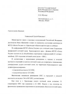 Министр связи России Н.Никифоров – депутату Госдумы С.П.Обухову: В нехватке почтовых отделений виноваты власти Краснодара
