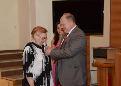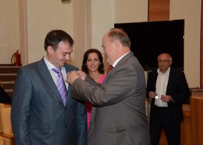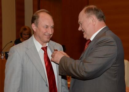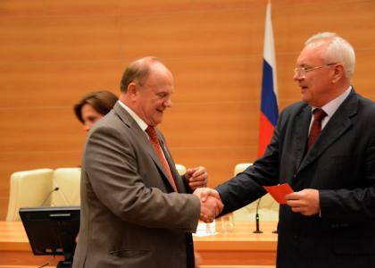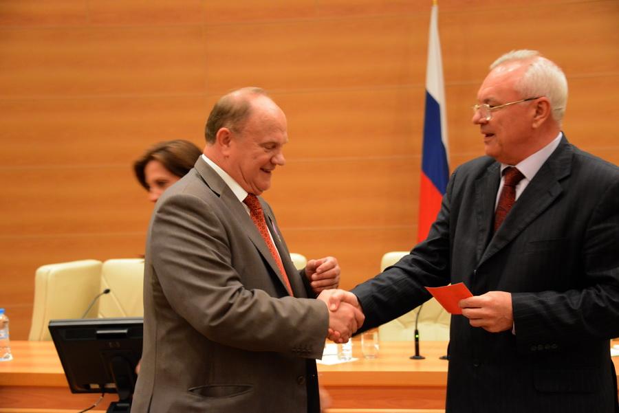 Затем состоялась торжественная часть заседания фракции. В ходе нее Г.А. Зюганова вручил депутатам-коммунистам памятные медали ЦК КПРФ в честь столетия со Дня рождения выдающегося летчика, трижды Героя Советского Союза А.И. Покрышкина.