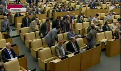 "Первый" телеканал в выпуске "Новостей рассказал о том, что в знак протеста против законопроекта о ликвидации РАН зал заседания покинули депутаты от фракции КПРФ и пообещали не возвращаться до осени.