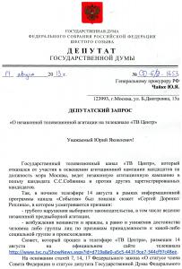 На основании статей 7, 14, 17 Федерального закона «О статусе члена Совета Федерации и статусе депутата Государственной Думы Федерального Собрания Российской Федерации» просим Вас принять соответствующие меры прокурорского реагирования по фактам нарушения законодательства, прав граждан и пресечь незаконную предвыборную агитацию в интересах кандидата в мэры Москвы С.С.Собянина на телеканале ТВ Центр.