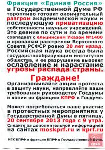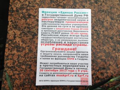 «Организовывайте акции протеста в защиту науки, направляйте ваши требования руководству Госдумы и копии во фракцию КПРФ в Госдуме. Может потребоваться ваше участие в протестных мероприятиях у Государственной Думы в пятницу 20 сентября с 9 утра. Следите за дополнительной информацией на сайтах moskprf.ru и kprf.ru», - говорится в листовке МГК КПРФ и фракции КПРФ в Госдуме.