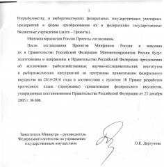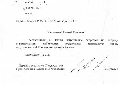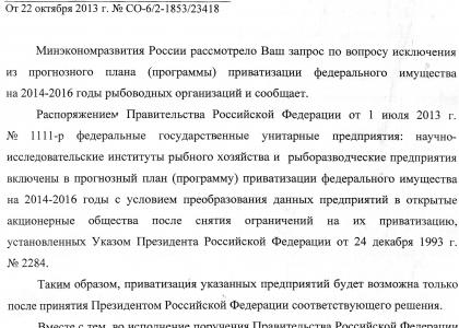 «После согласования проектов Минфином РФ и внесения их в Правительство РФ Минэкономразвития России будут подготовлены и напарвлены в Правительство РФ предложения об исключении рыбохозяйственных научно-исследовательских институтов и рыборазводческих предприятий из программы приватизации федерального имущества на 2014-2016 годы в соответствии с пунктом 18 Правил разработки прогнозного плана (программы) приватизации федерального имущества, утвержденных постановлением Правительства РФ от 25 декабря 2005 г. № 806», - сообщил депутату И. Шувалов.