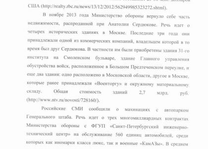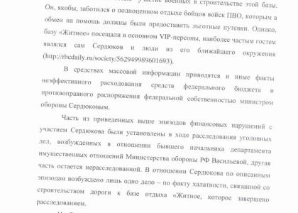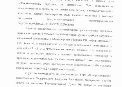 «Необходимость проведения парламентского расследования диктуется накопившимся в обществе возмущением сложившейся во властных структурах практикой замалчивания всего, что связано с деятельностью Сердюкова на посту министра обороны, в то время как средства массовой информации регулярно сообщают гражданам о фактах разбазаривания государственной собственности в военном ведомстве, выявленных случаях причинения ущерба бюджету страны и ее обороноспособности», – говорится в обращении.