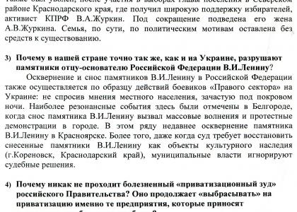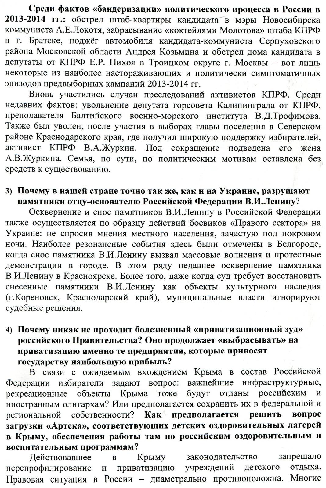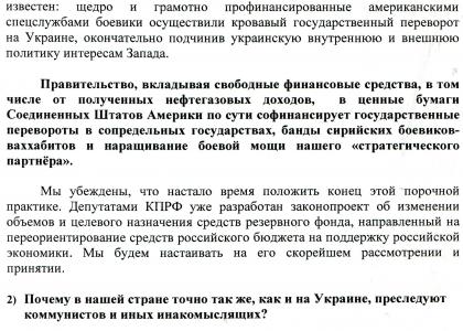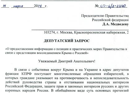 В связи с событиями вокруг Крыма и на Украине в адрес депутатов фракции КПРФ поступают многочисленные обращения избирателей, в которых граждане указывают на противоречивость и непоследовательность действий руководства страны в отстаивании национальных интересов Российской Федерации, защите прав и законных интересов русских и других коренных народов России. В обобщённом виде суть основных претензий граждан нашей страны к руководителям государства (в т.ч. к Правительству и депутатам Государственной Думы) сводится к следующему: