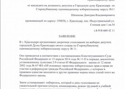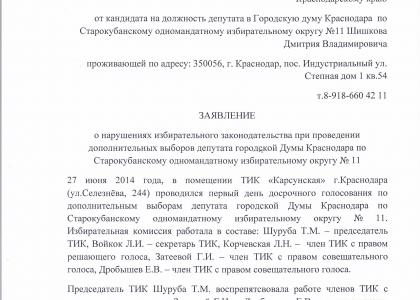 Вышеизложенные факты нарушений законодательства приведены, в частности, в обращениях в мой адрес кандидата в депутаты в Городскую думу Краснодара по Старокубанскому одномандатному избирательному округу №11 Шишкова Дмитрия Владимировича.
